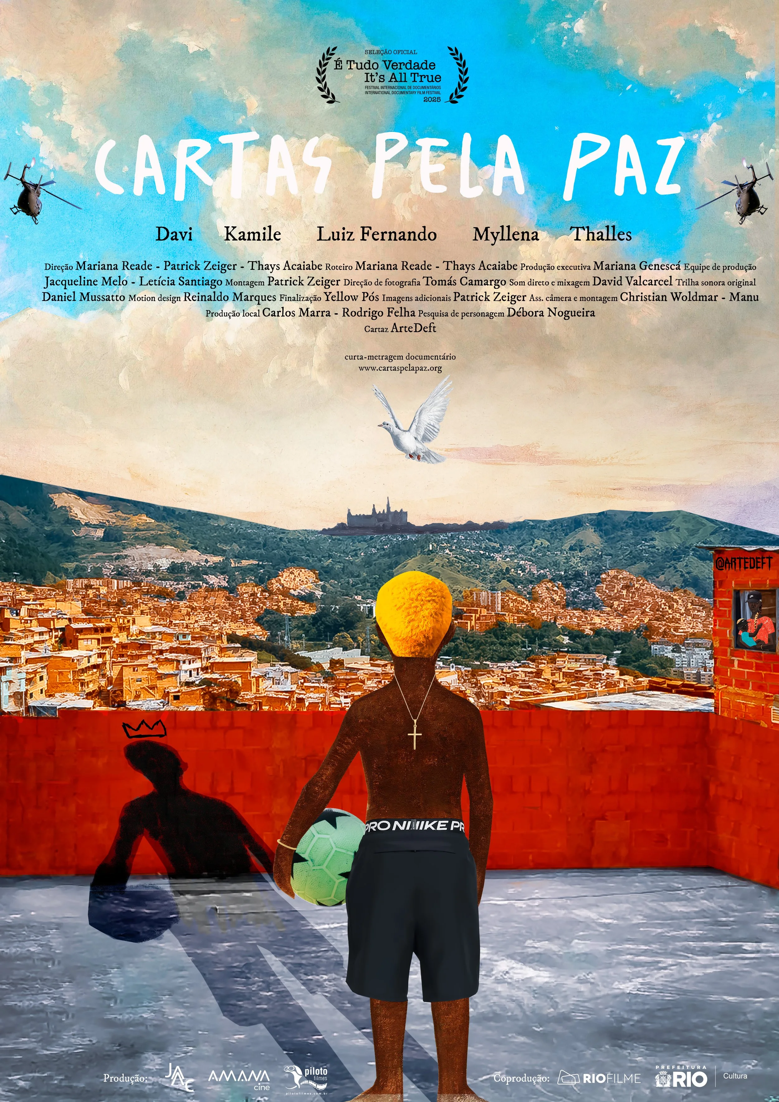 Letters for Peace is co-directed by Mariana Reade, Thays Acaiabe, and Patrick Zeiger. Mariana Reade has created and directed socially impactful documentaries such as Ponto Forte (2009) and Farto de Solidão (2007). Patrick Zeiger is the director and editor of Acabou a Copa (2015), which won the award for best editing at the 12MFF Festival, and Universidade Tabuleiro (2019), selected for the Freeman Film Festival. Thays Acaiabe makes her debut as a director and screenwriter with the short film Cartas pela Paz.